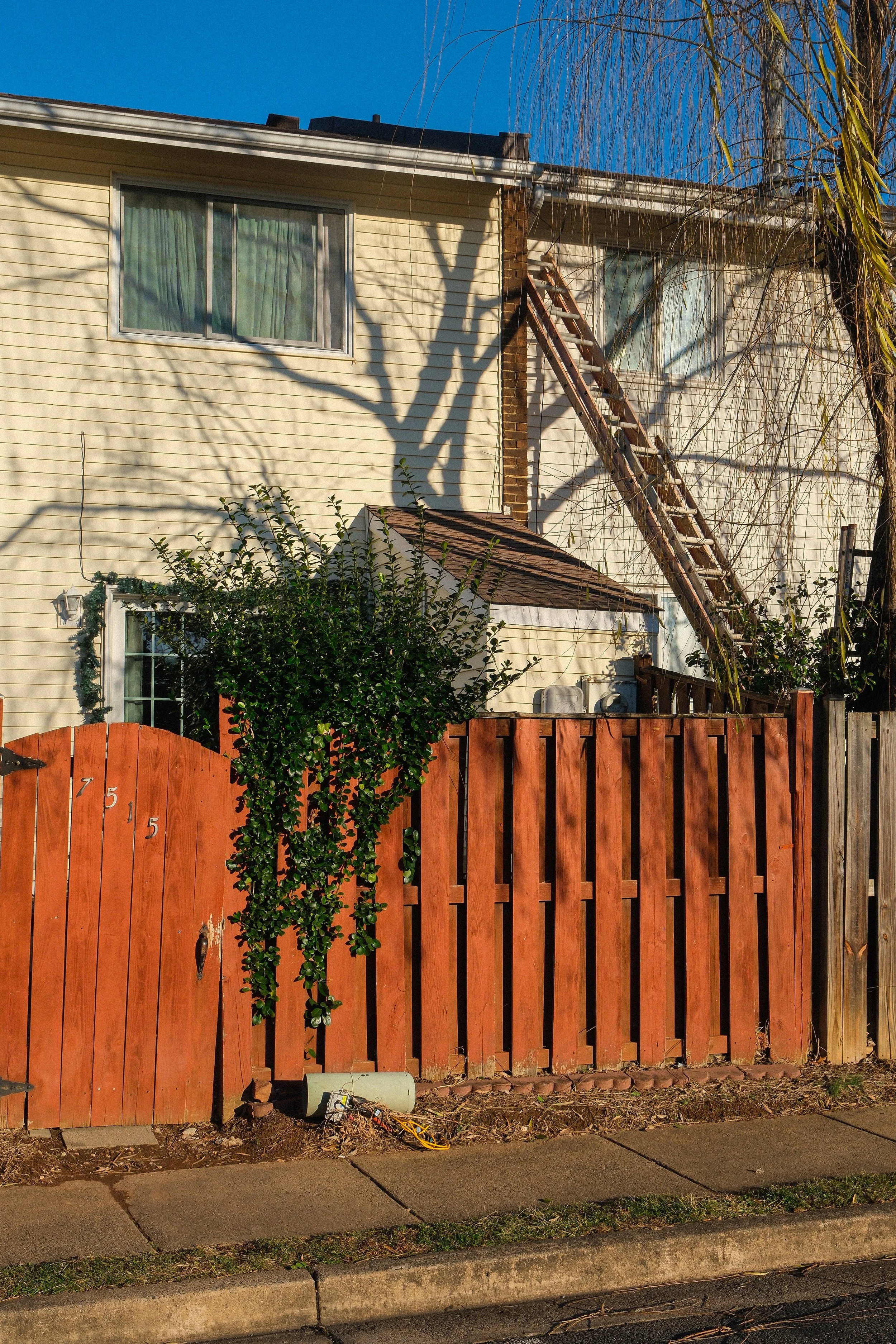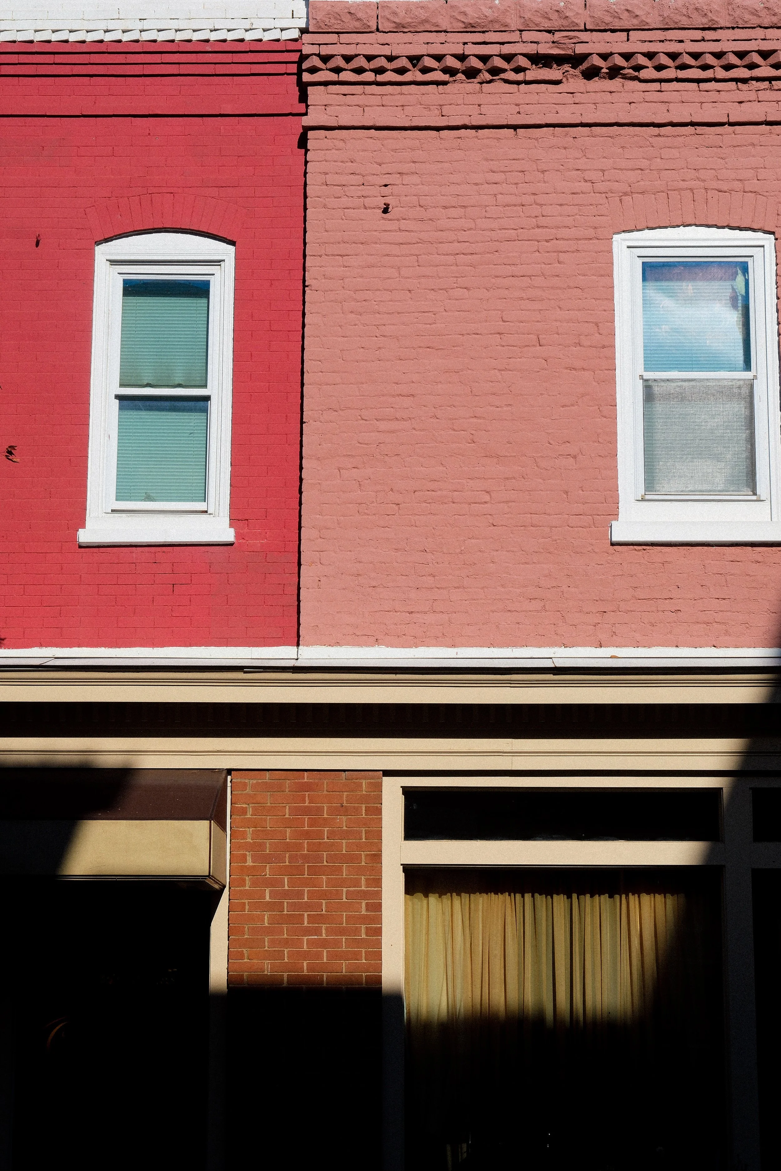 Colorful brick building facade with red and pink sections, two windows, shadowed lower half.