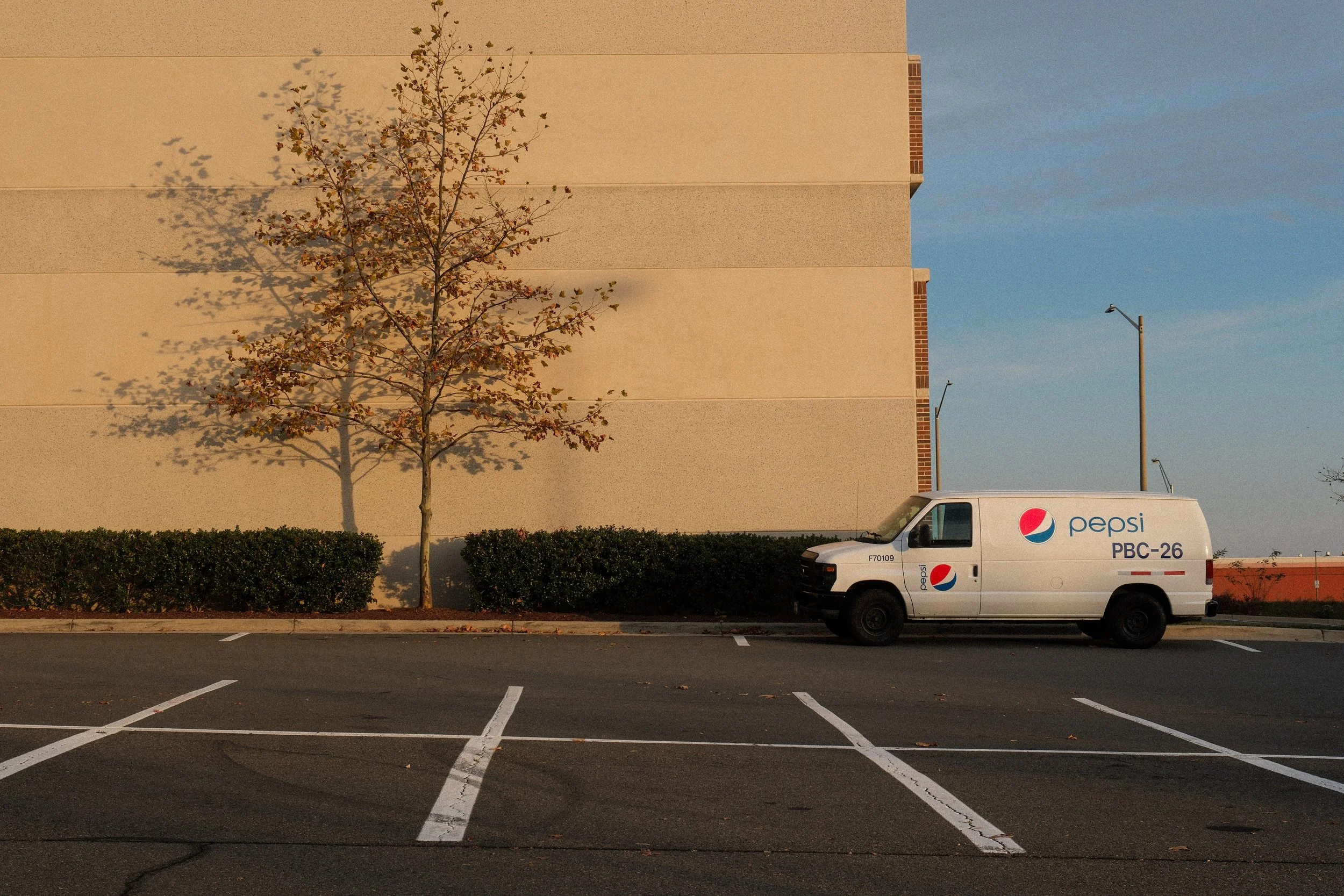 Pepsi delivery van parked in an empty lot next to a beige building wall, with a tree and its shadow visible.