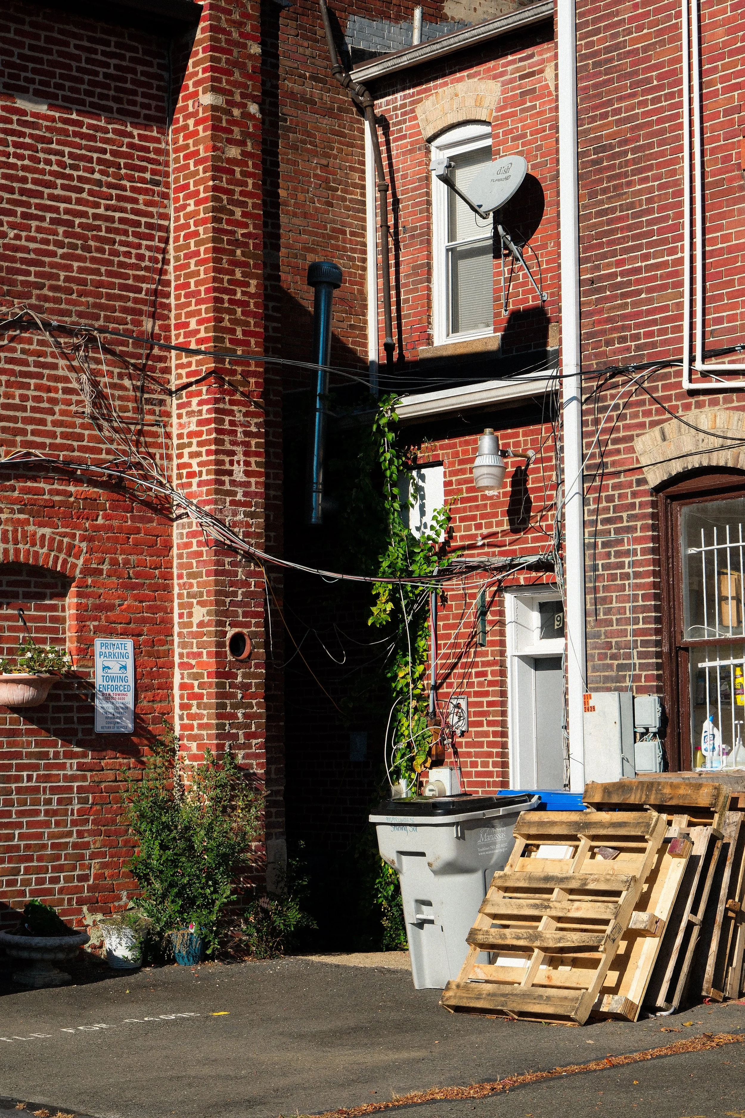 Urban alley with brick buildings, satellite dish, overhead cables, and stacked wooden pallets.