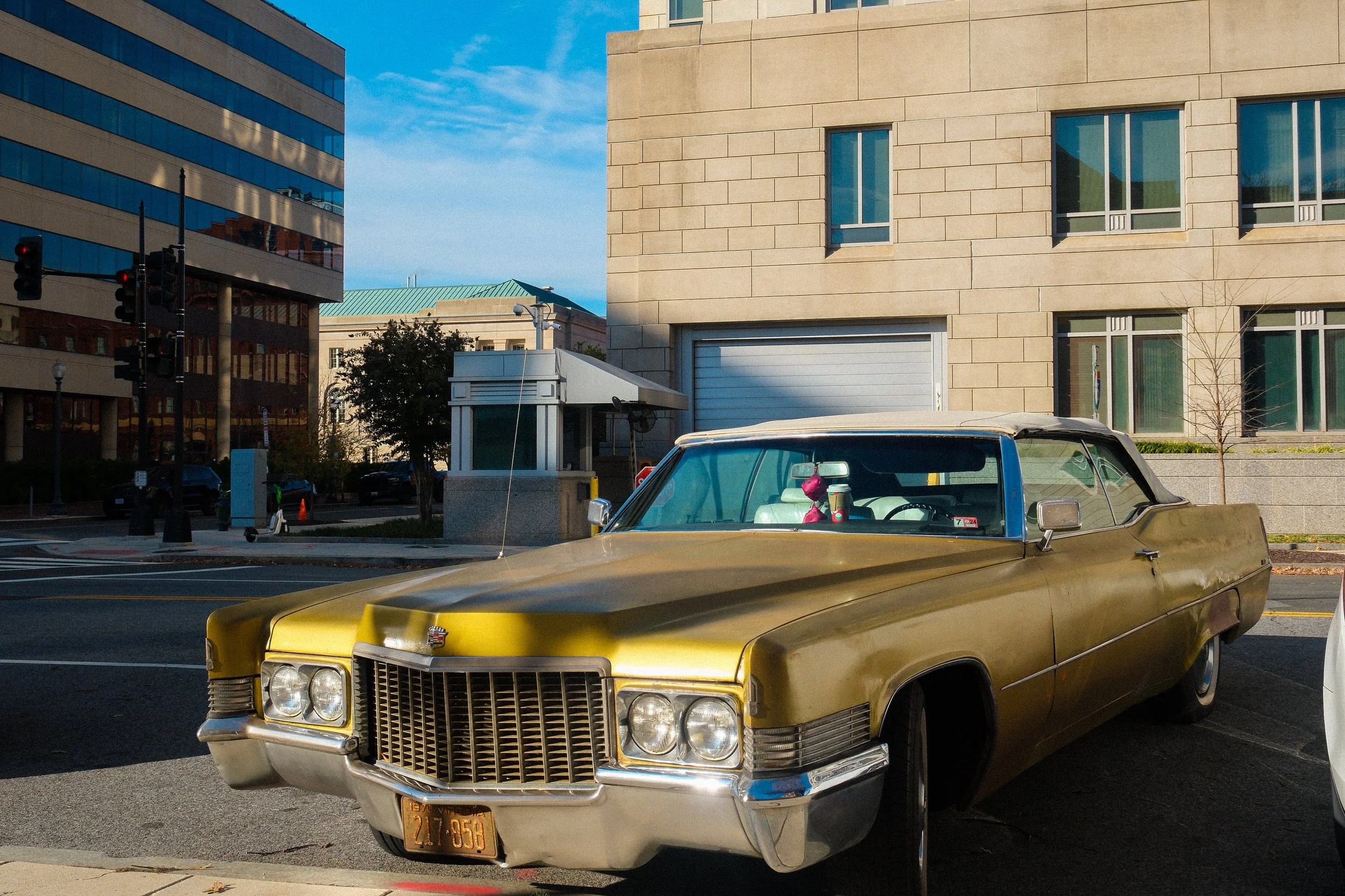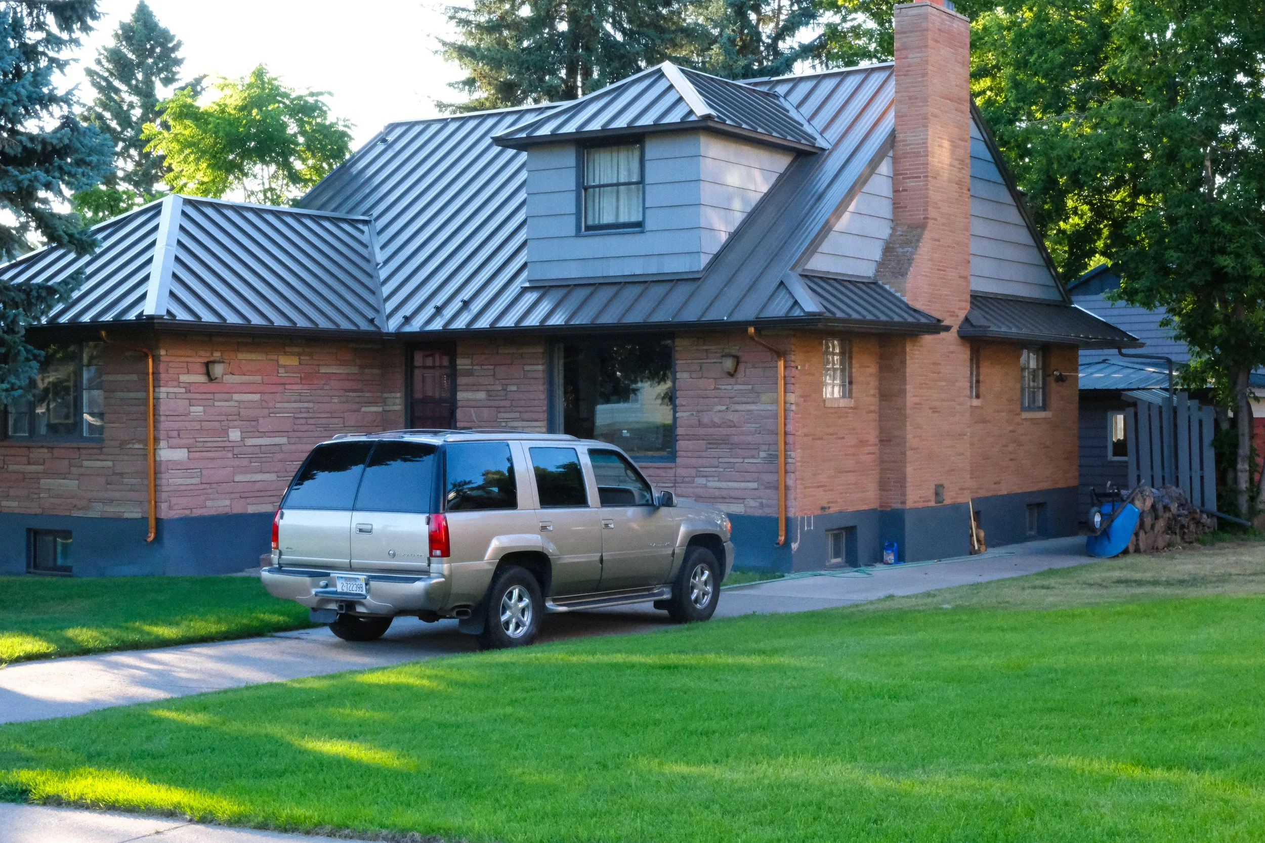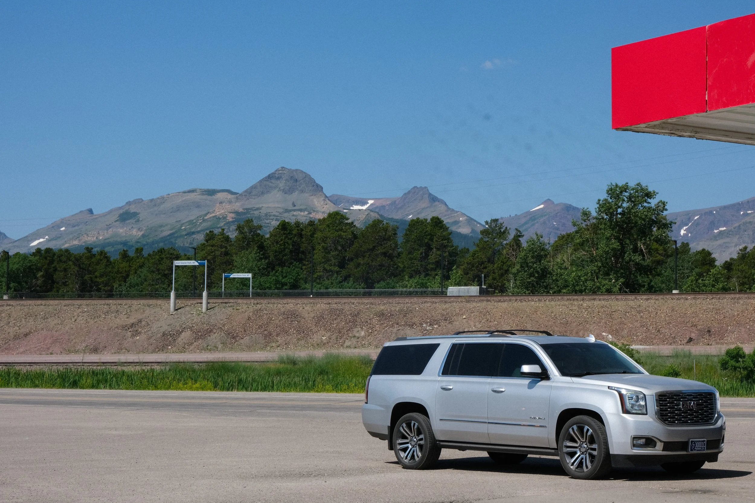 Silver GMC SUV parked in a lot with mountains and trees in the background under a clear blue sky.