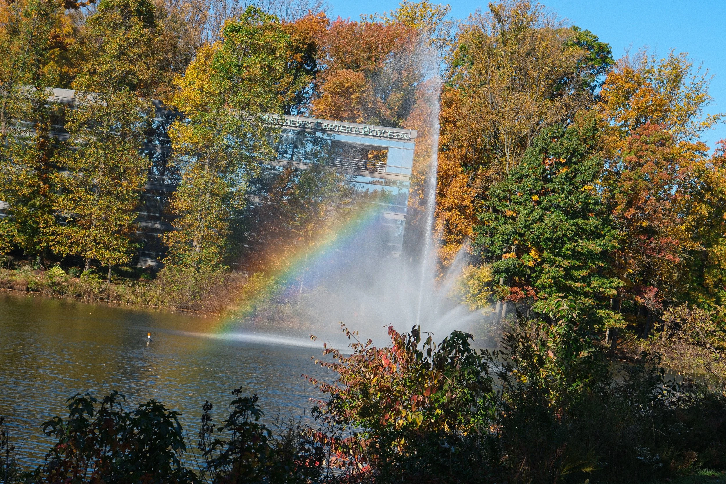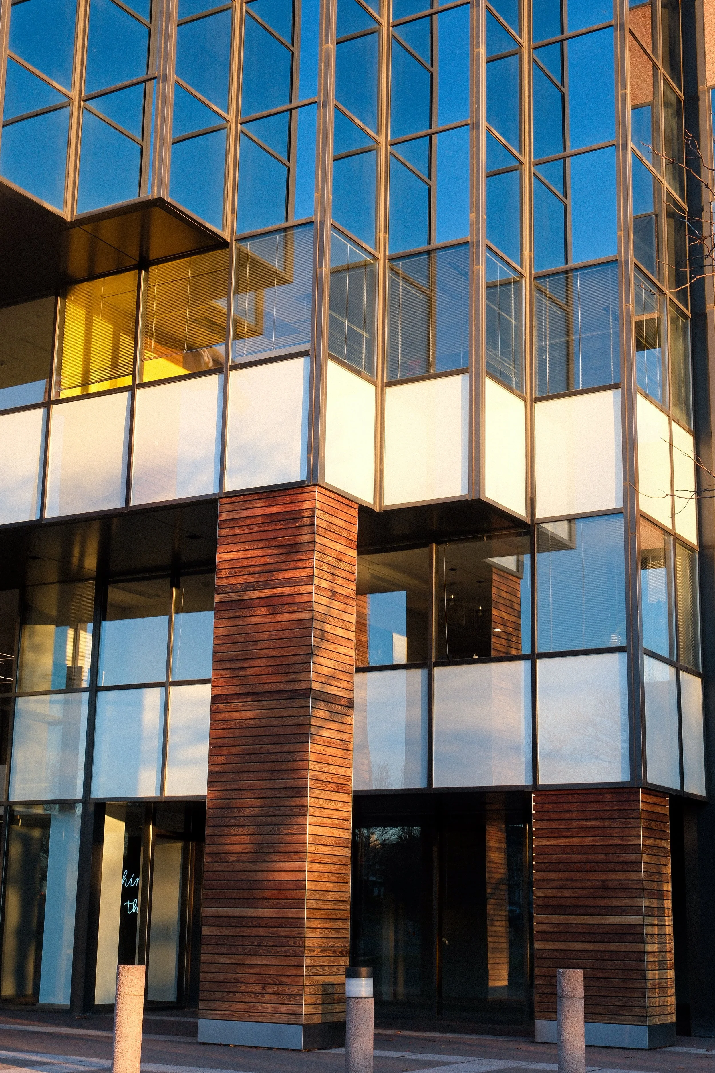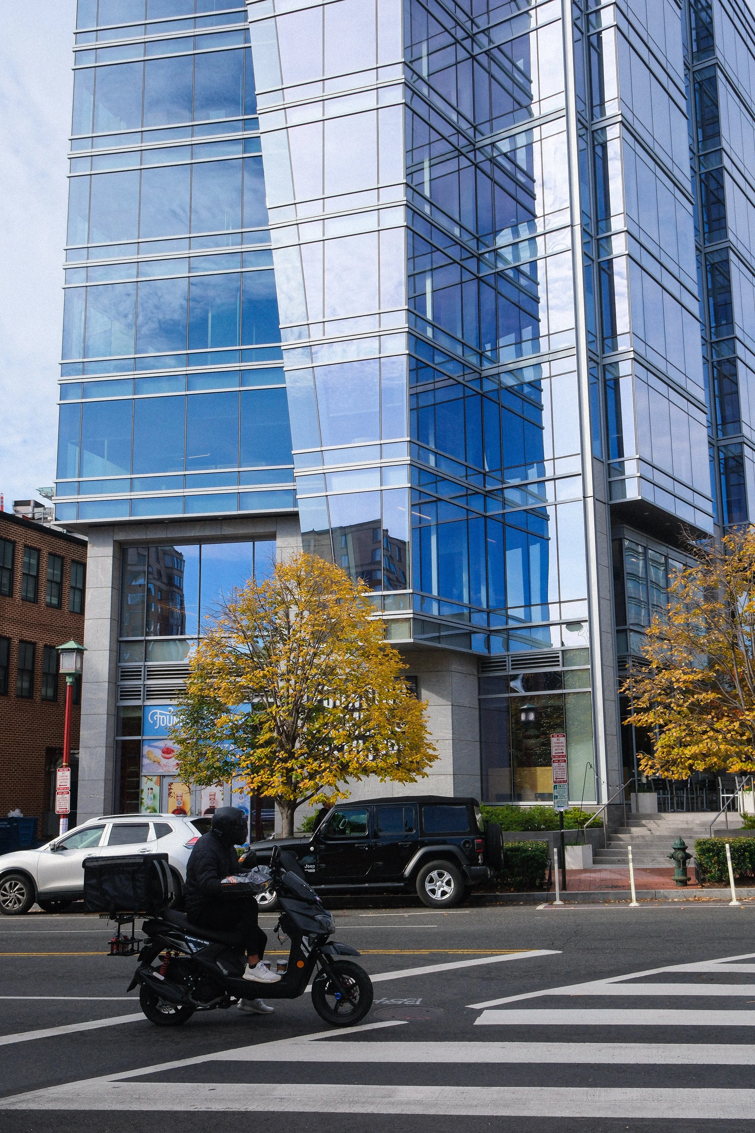 Person on a motor scooter in front of a modern glass building, autumn trees on the street.