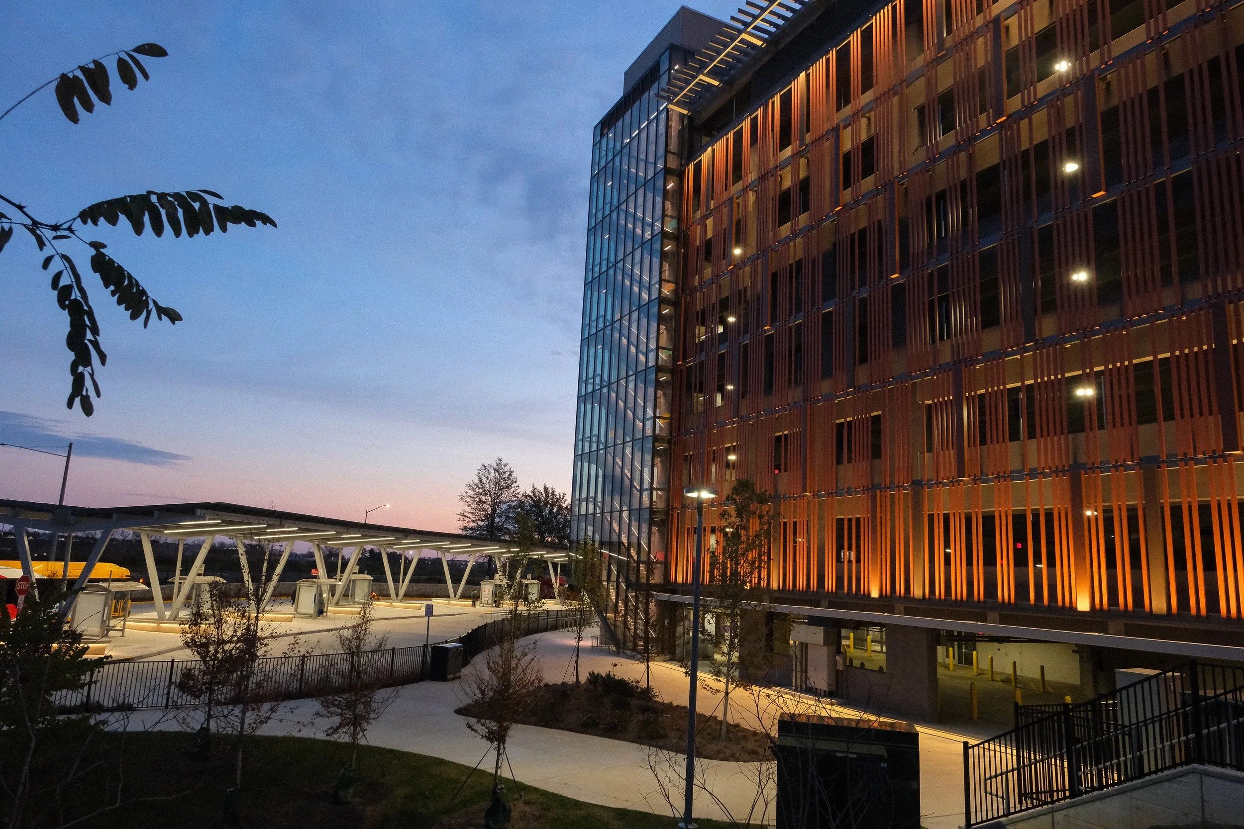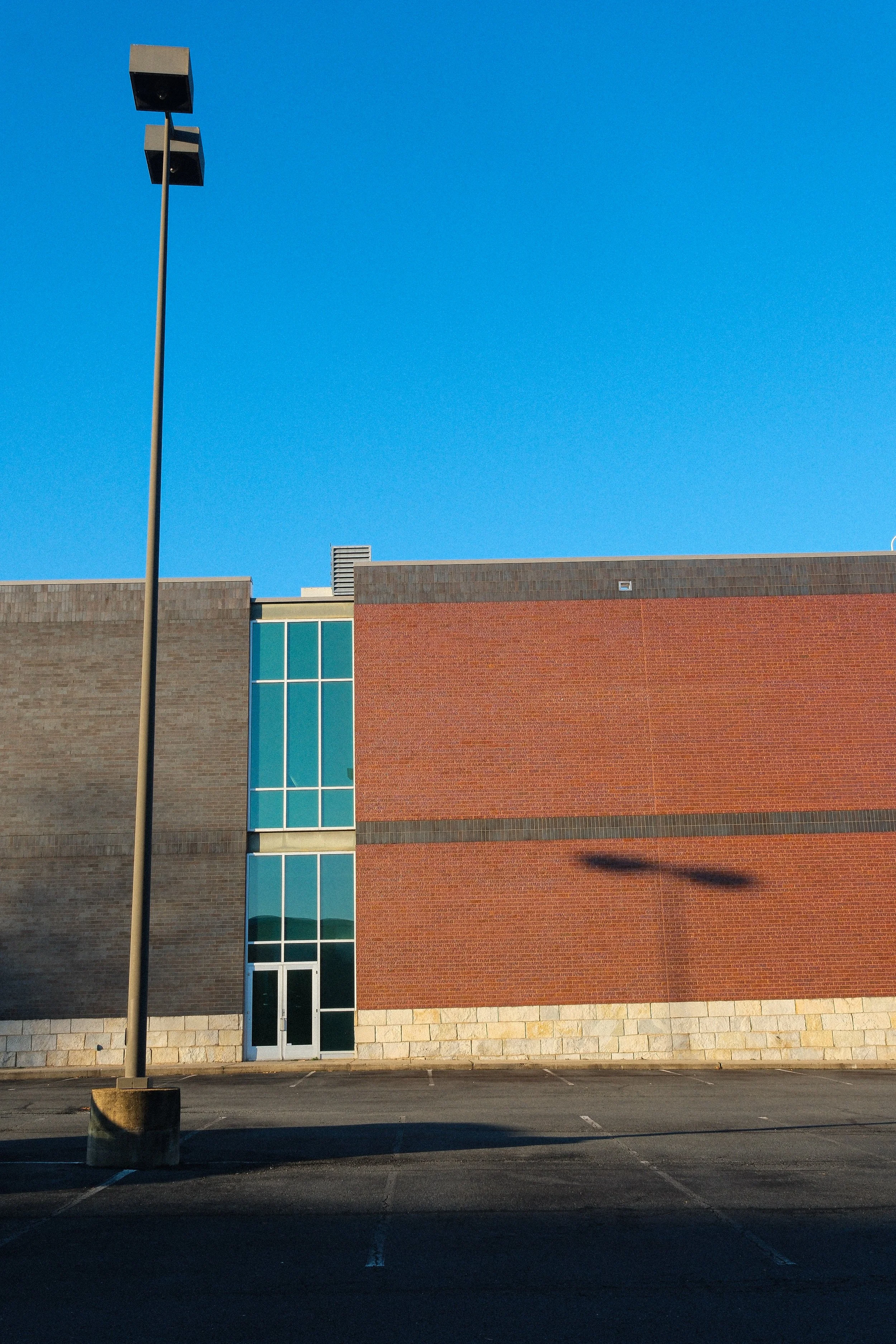 Empty parking lot with a streetlamp and brick building, clear blue sky.