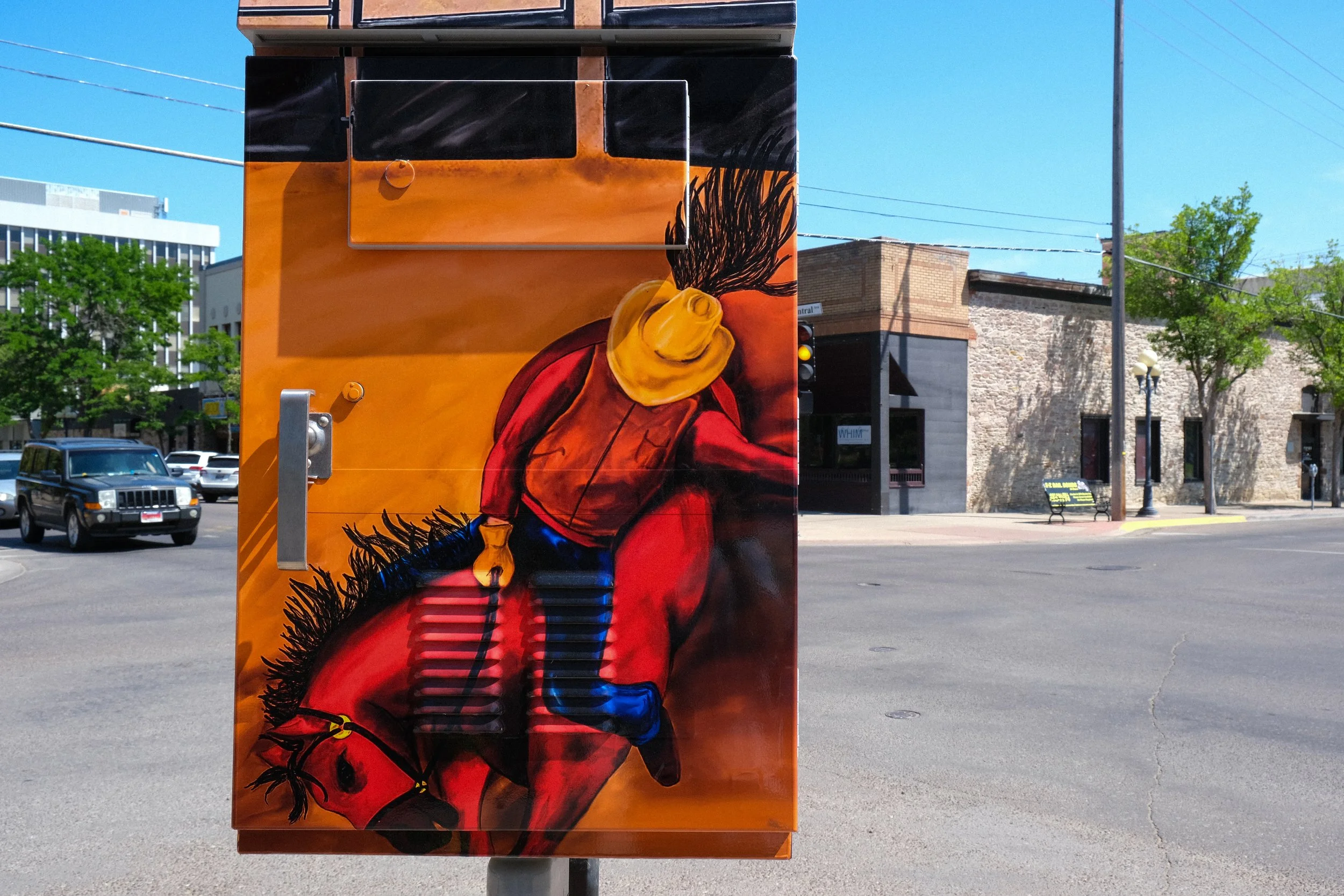 Urban street art on utility box depicting a cowboy on a bucking horse in the city.