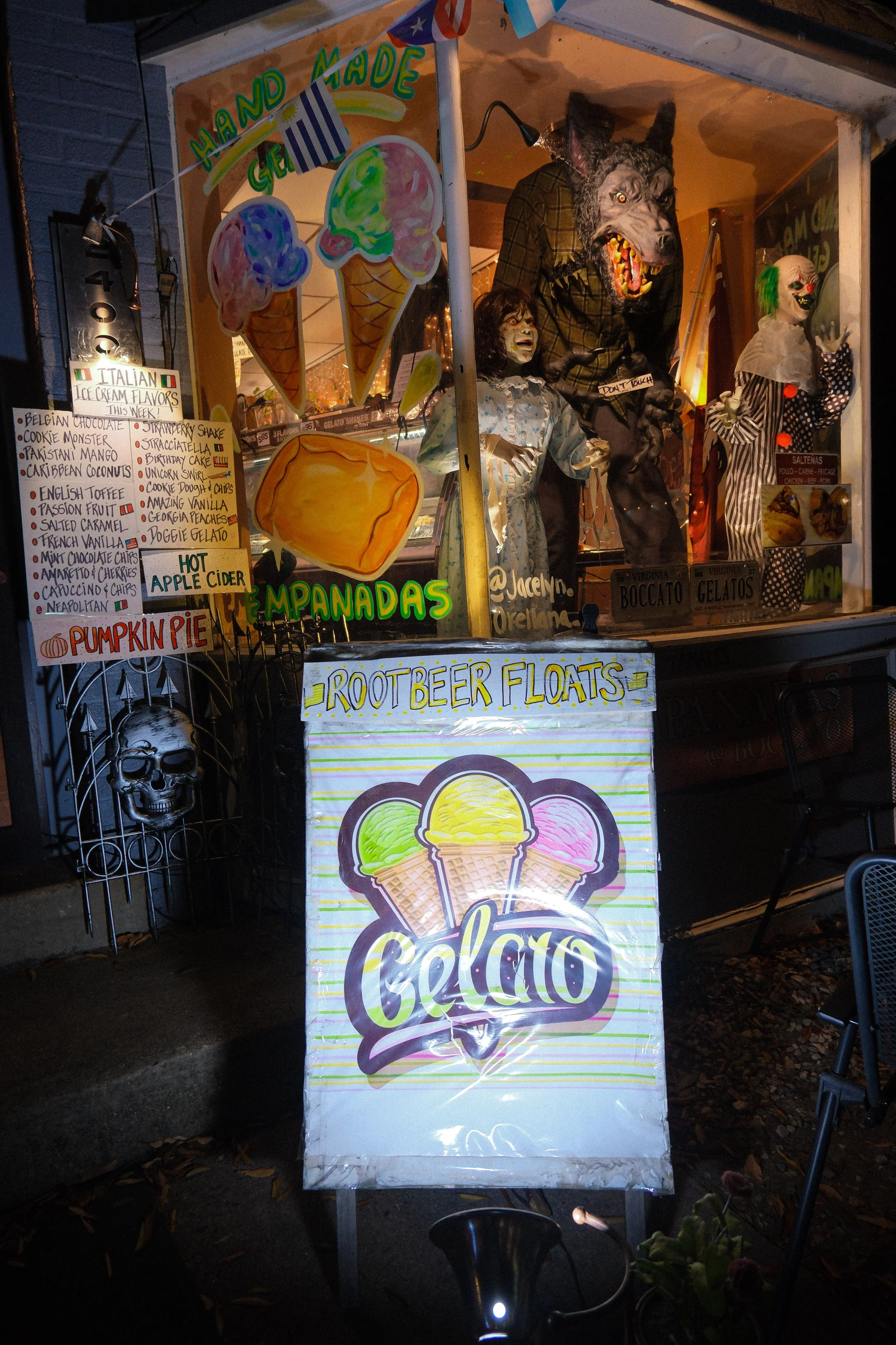 Halloween-themed ice cream shop window with puppet display and signage for gelato flavors, empanadas, pumpkin pie, and root beer floats.