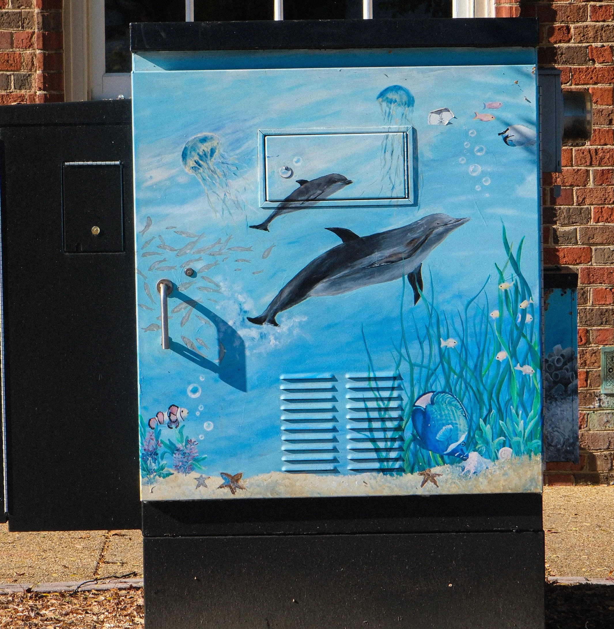 Street utility box with ocean-themed mural depicting dolphins, jellyfish, fish, seaweed, and coral.