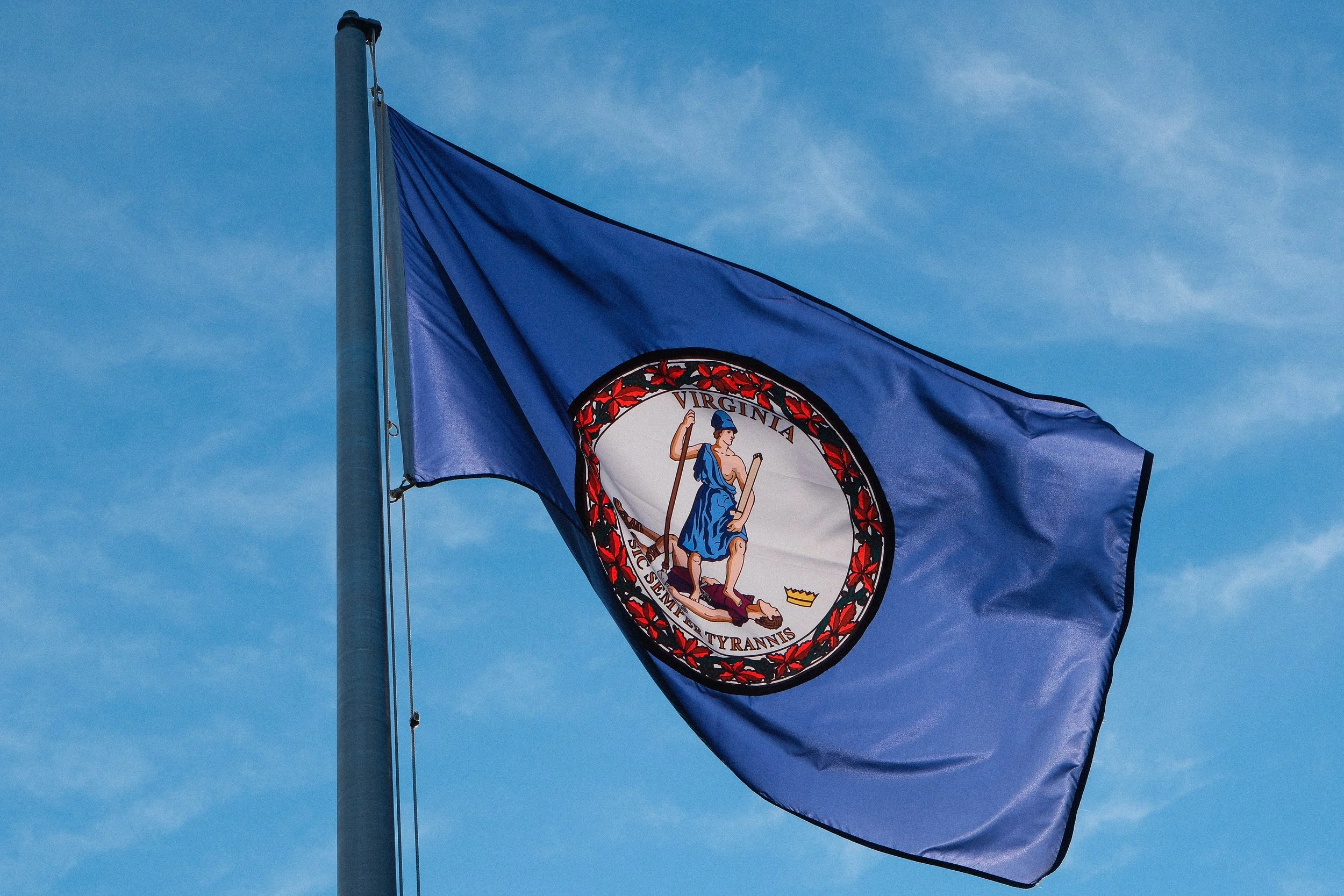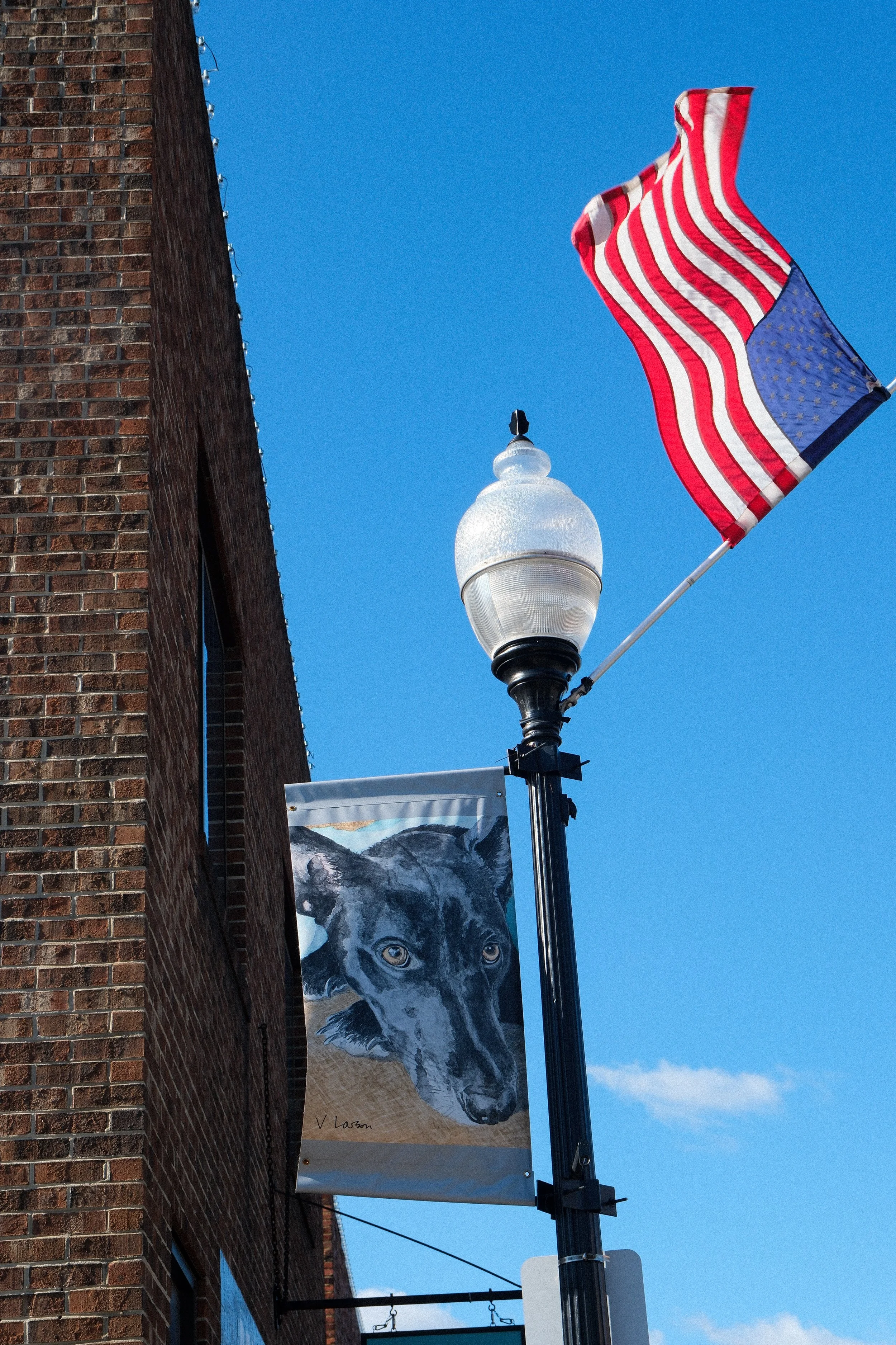 Street lamp post with American flag and dog artwork banner near brick building under blue sky.