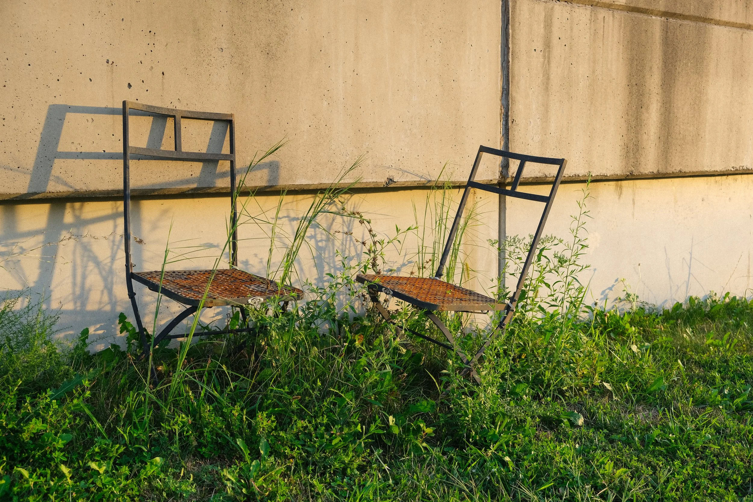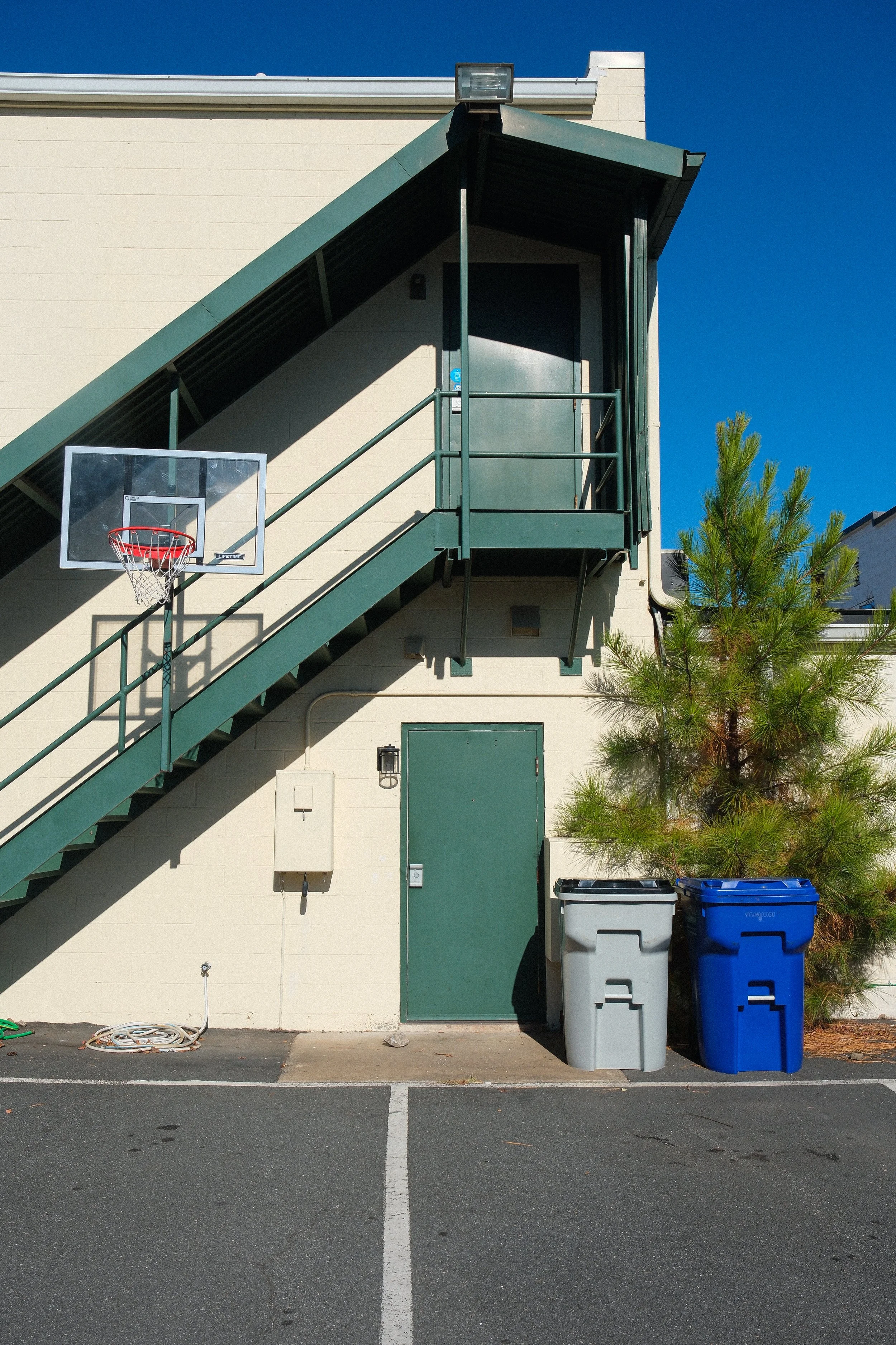 Exterior of a building with a green metal staircase, basketball hoop, two trash bins, a green door, and a small tree.