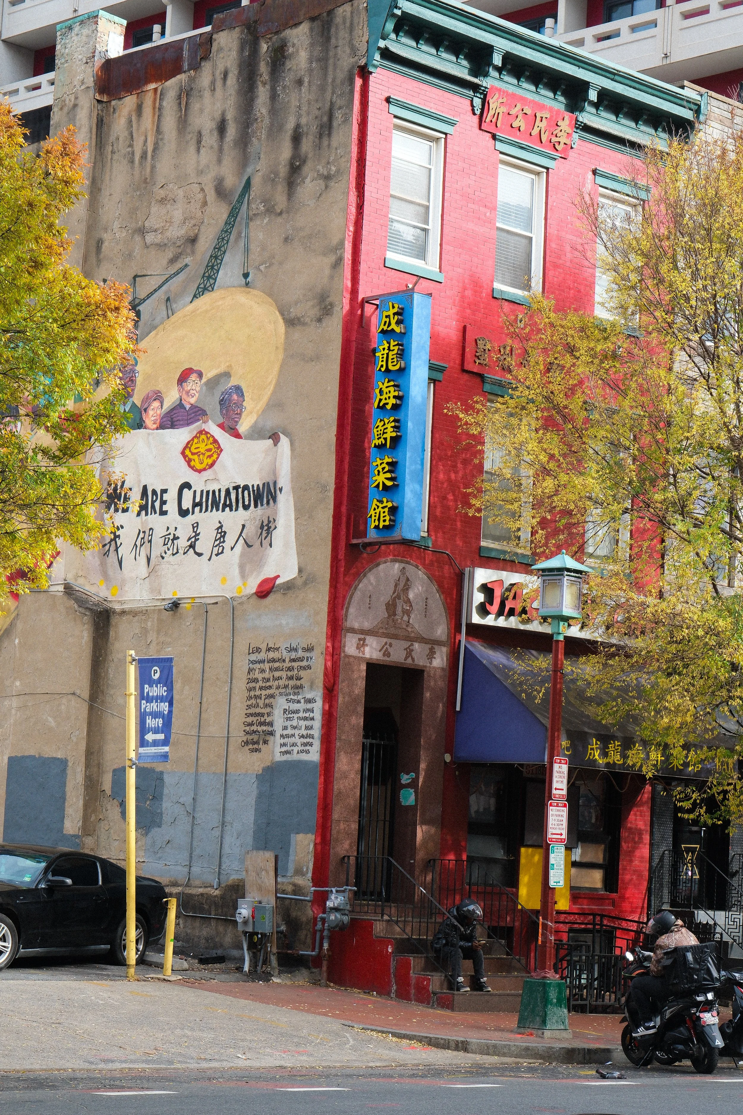 Street view of Chinatown mural and building, with people on sidewalk and motorbike, autumn trees, and parking sign.