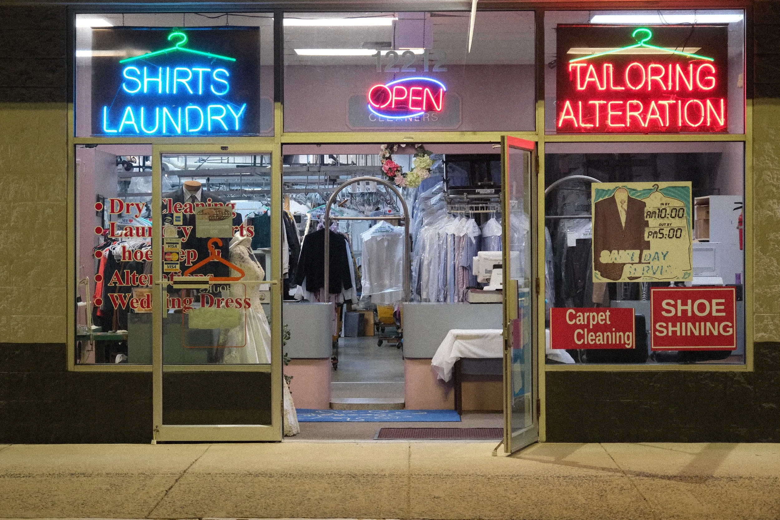Exterior of a laundry and tailor shop with neon signs for shirts laundry, tailoring, alteration, and open above the entrance. Windows display services like dry cleaning, shoe repair, carpet cleaning, and shoe shining. Inside are racks of clothes.